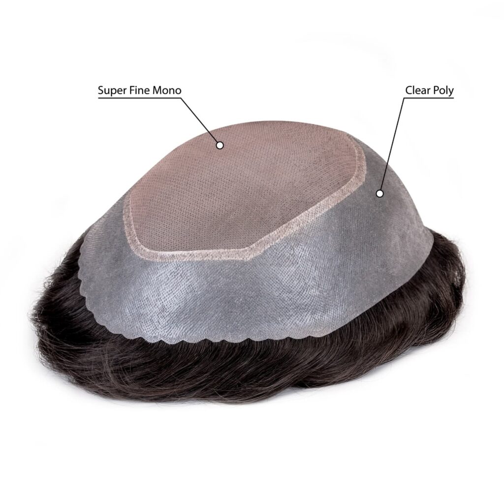 Mono toupee for men offer durable but breathable super fine monofilament base, with poly all around and scalloped front in a 10”L x 8”W maximum size. Can be cut down as small as 7.5″ x 5.5″ still leaving poly for attachment.